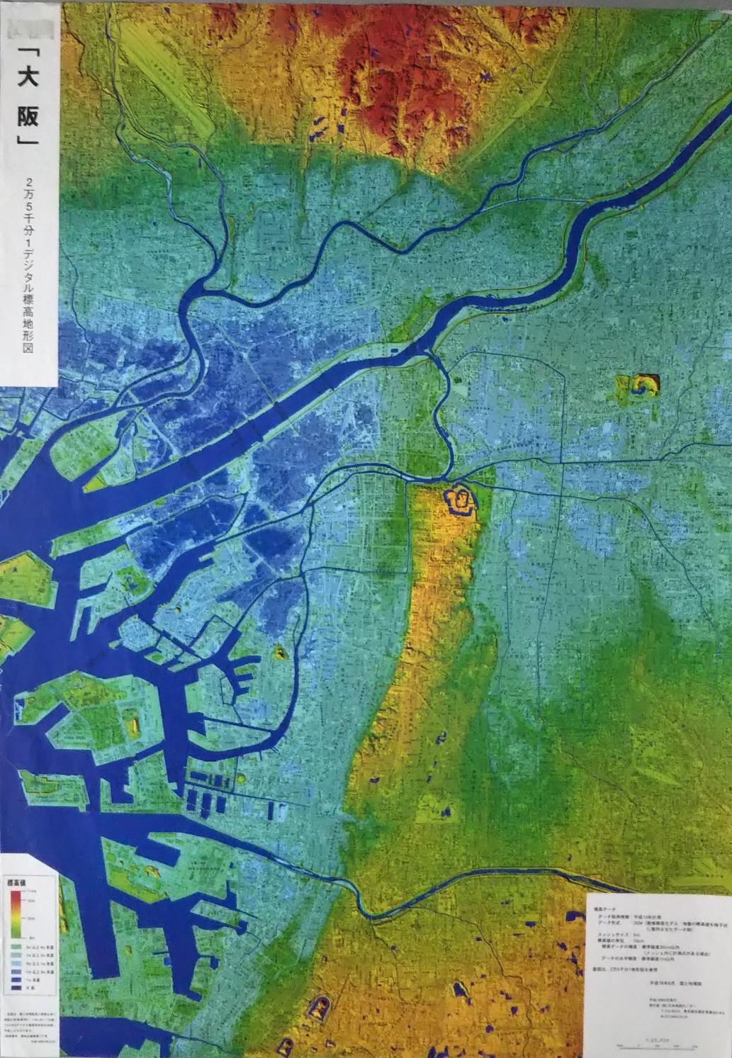 「数値地図5mメッシュ(標高)」の標高データを元に色付けして作成した陰影段彩図に2万5千分の1地形図を重ねて作成した地図です。詳細な地形の形状や地域における高低差を分かりやすく表現してます。作成地域は「仙台」「東京都区部」「濃尾平野西部」「名古屋」「大阪」「高知」「福岡」の7地区 東京都区部、名古屋、大阪、福岡